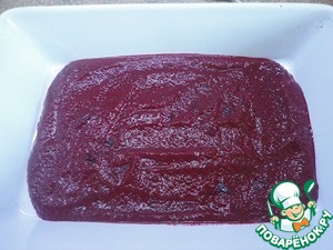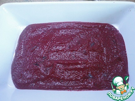 Набухший желатин распустите на водяной бане или в микроволновке и соедините со свеклой. Вылейте в подходящую форму и уберите в холодильник до полного застывания.