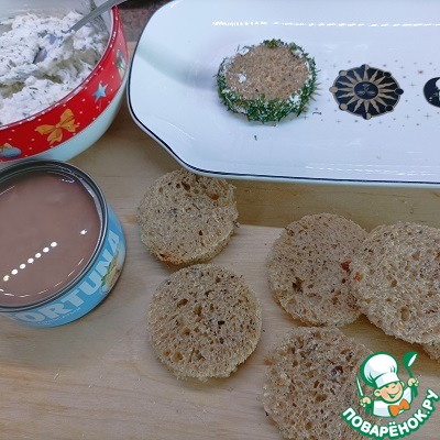 Из хлеба вырежьте кружочки. Бока смажьте сырной массой и обсыпьте укрупом.