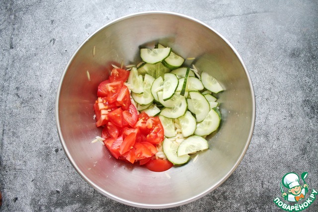 Помидору и свежий огурец порежьте дольками и добавьте в салатник с пастой.