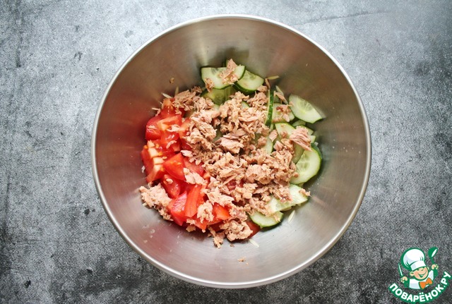 Тунец ТМ "FORTUNA" разомните на мелкие кусочки и положите в салат. Все хорошо перемешайте и уберите в холодильник на 15 минут.