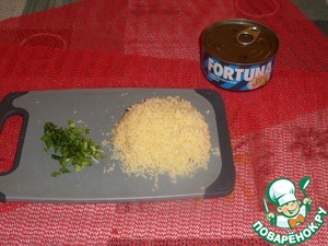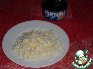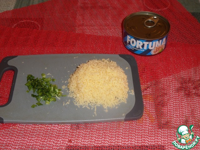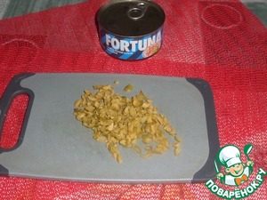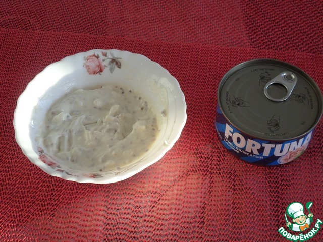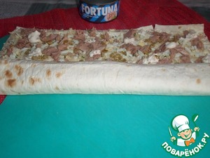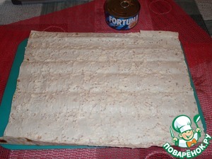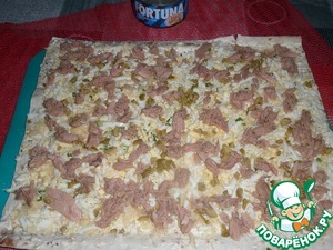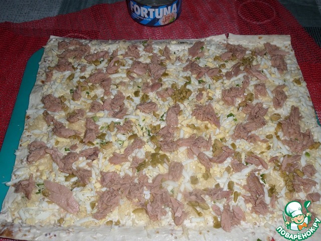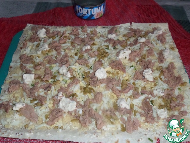 Открываем баночку тунца и сливаем жидкость. Рыбу немного разминаем вилкой и выкладываем на лаваш.