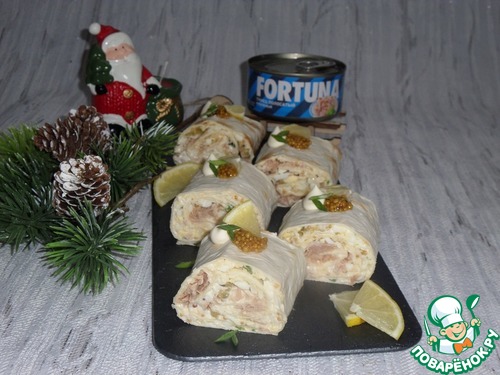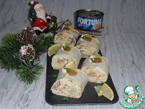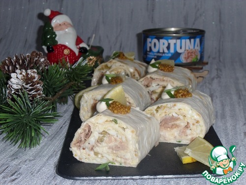 Рулет из лаваша - одна из самых популярных и быстрых в приготовлении закусок на праздничный стол. Сегодня у меня рулет с тунцом "Fortuna". Получается очень быстро, вкусно и празднично!!!