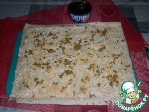 Затем равномерно выкладываем на лаваш натертый сыр и зелень.