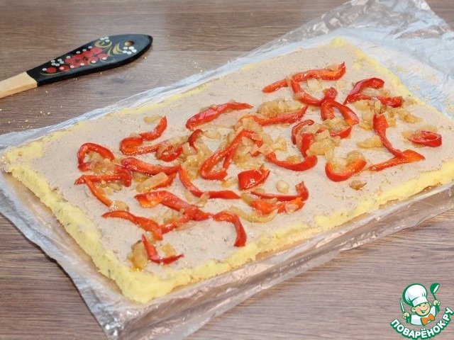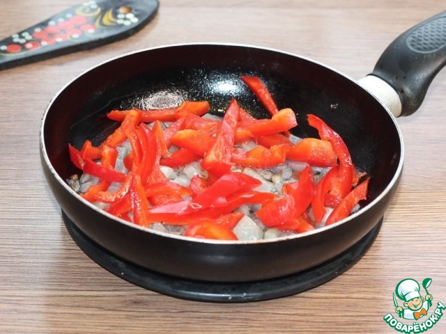 13. Кладем лук с перцем.