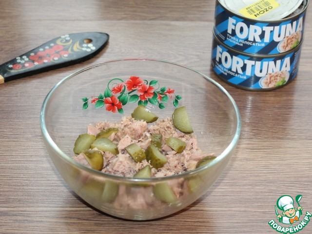 7. Выкладываем тунец без жидкости в миску и добавляем маринованный огурец.