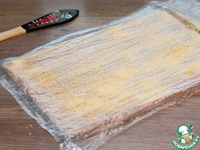 9. Пищевую пленку (или пакет) кладем на разделочную доску и смазываем растительным маслом. Посыпаем панировочными сухарями (1 ст. л.).