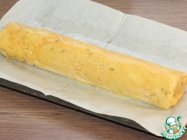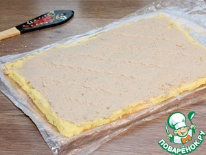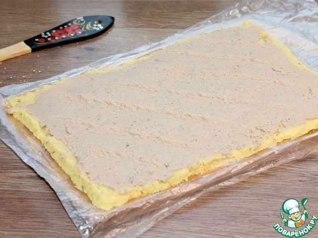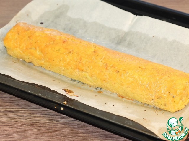 16. Включаем духовку на t 190 С. Застилаем противень пекарской бумагой и смазываем маслом. Кладем рулет.