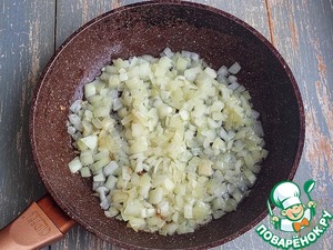 Пока тесто подходит, приготовим начинку. Репчатый лук очистить, помыть, нарезать кубиками. Обжарить в растительном масле до прозрачности.