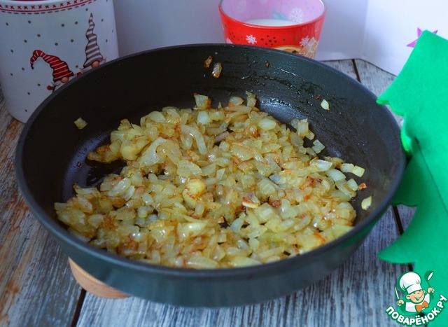 Лук нарезать мелким кубиком, обжарить на растительном масле с добавлением сахара и специй. Остудить.