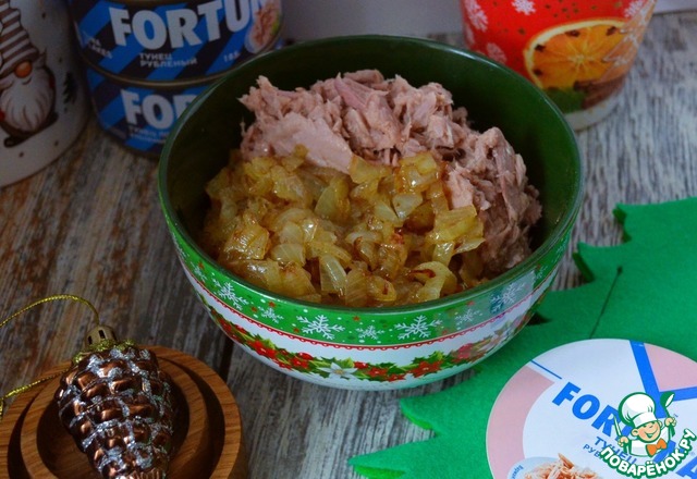 Тунец (1,5 -2 банки) освободить от жидкости, смешать с жареным луком. Посолить по вкусу.