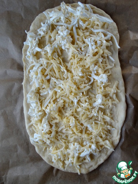 Выложить на тесто сыр (оставив немного для верха).