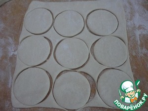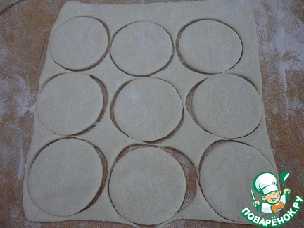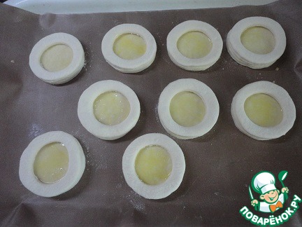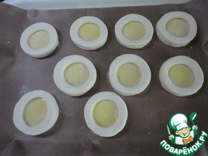Целые кружочки смазать слегка взбитым яйцом (осторожно, чтобы яйцо не стекло по бокам, иначе тесто склеится и не расслоится). Уложить кольца и тоже смазать их яйцом. Оставить расстояться на 30 минут. Выпекать 10-15 минут при температуре 200 *.