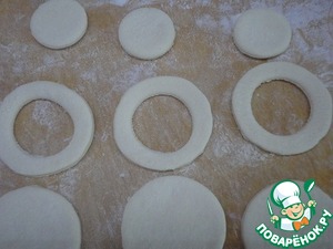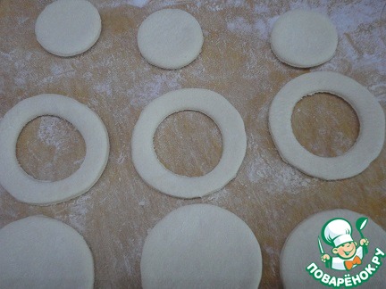 Из второй половины вырезать столько же кружочков и в них вырезать кружки меньшего диаметра, чтобы получились кольца.