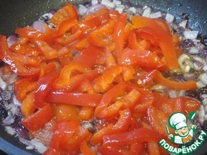 Добавить перец. Продолжать карамелизовать на среднем огне. Если перец хороший, то начинка приобретает сладкий вкус без добавления сахара.