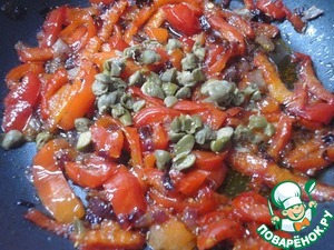 Через минут 10 добавить смесь итальянских трав и смесь перцев. Каперсы разрезать на половинки и тоже добавить к перцу. Потомить еще минуты 3. Остудить.