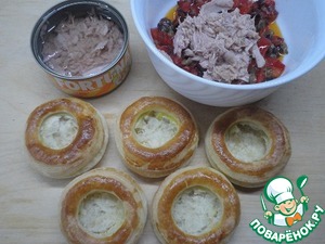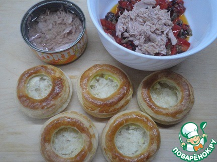 В остывших волованах острым ножом я углубляю серединку, чтобы вошло побольше начинки. К перцу добавить тунец и осторожно перемешать.