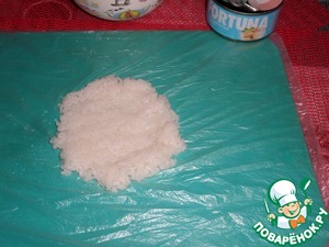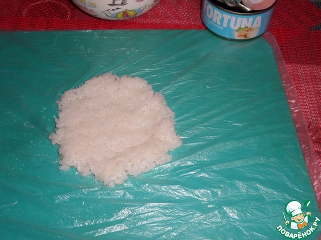 • На рабочую поверхность кладем кусок пищевой пленки и слегка смачиваем ее водой. Выкладываем на пленку 100-110 гр подготовленного риса и делаем из него лепешку. Удобнее всего делать, немного смочив руки водой.