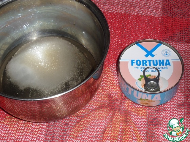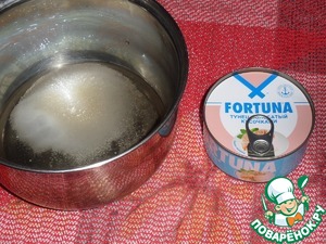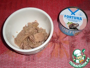 Открываем баночку консервированного тунца, сливаем жидкость и выкладываем рыбу в глубокую миску. Я использую тунец "Fortuna".