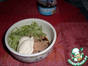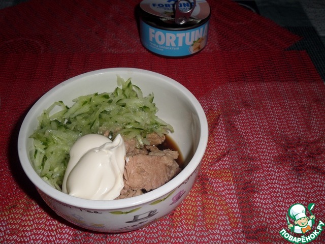 • В миску к рыбе добавляем огурец, майонез и соевый соус.