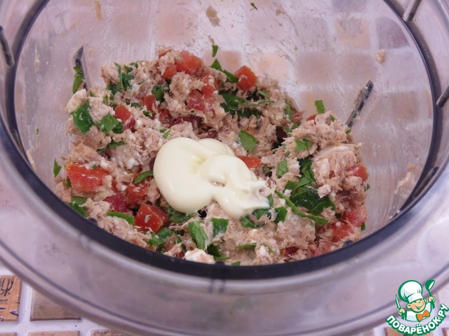 Пока впекается наша основа, займемся начинкой. Тунец (предварительно слив из него жидкость) и фетаку переложить в блендер. Измельчить и перемешать.