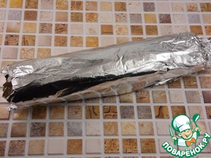 Свернуть в тугой рулет, завернуть в фольгу и убрать в холодильник на 30 минут. Затем нарезать порционными кусочками.