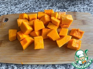 Чистим тыкву, нарезаем её средним кубиком, выкладываем на противень, сбрызгиваем растительным маслом, присыпаем солью и запекаем в духовке при 180 градусах минут 15-20.