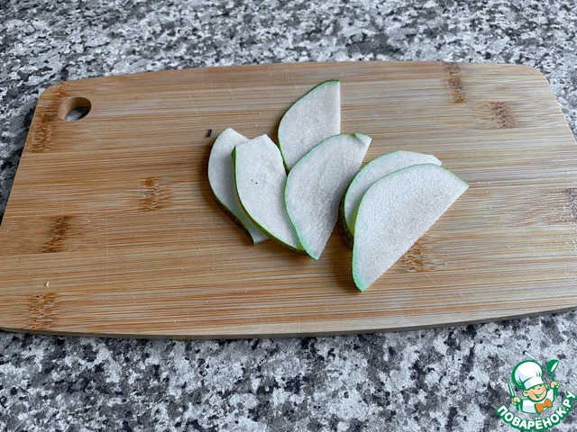 Грушу промываем, режем пополам, удаляем сердцевину и нарезаем тонким слайсом.