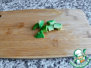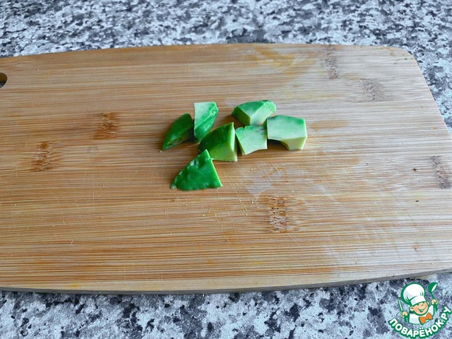 Авокадо чистим, удаляем косточку и нарезаем средним кубиком.