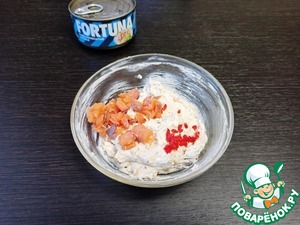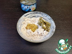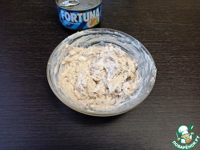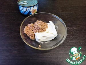Консервированного тунца размять вилкой и добавить к сливочному сыру (крем-чиз).