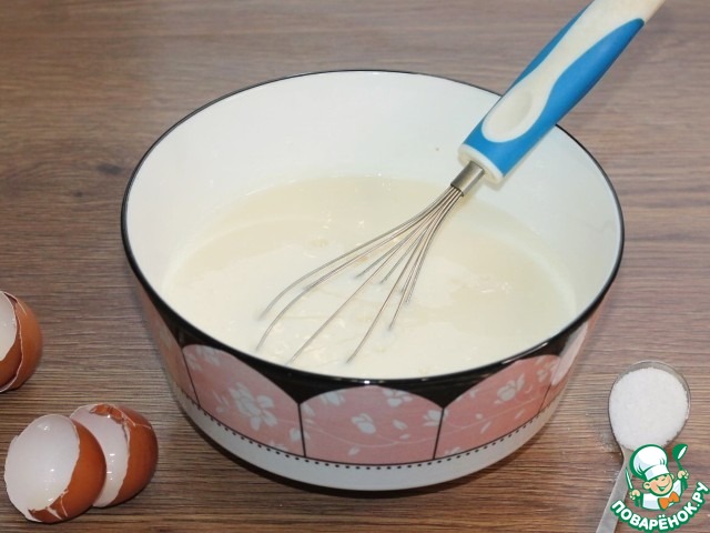 • 1. Приготовим тесто. Взбиваем венчиком куриные яйца (2 шт) и вливаем в миску кефир (800 мл). Добавляем соль (1,5 ч. л.) и сахар (1 ч. л.).