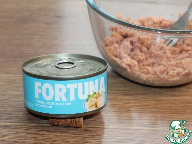 • 5. Приготовим начинку. Выкладываем тунец без жидкости в миску. Если тунец кусочками, то разминаем его вилкой.