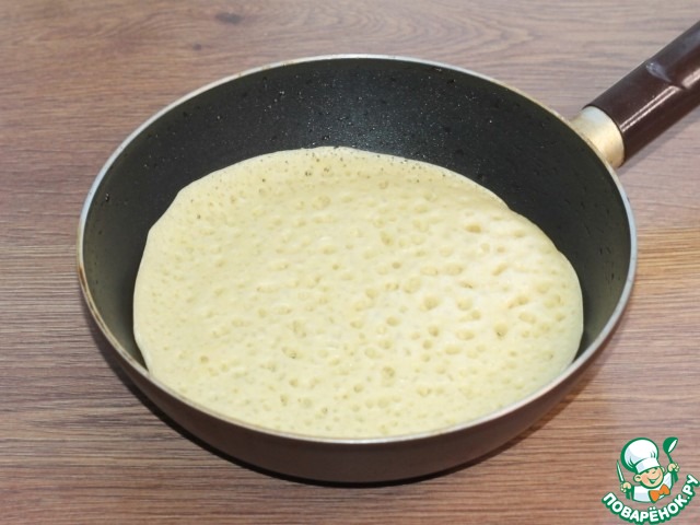 • 11. Смазываем сковороду (ф=20 см) растительным маслом (только для 1 блина) и разогреваем. Жарим блинчики с 2 сторон.