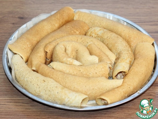 • 15. Формируем из блинных рулетиков пирог. Из этого количества блинных рулетов, выходит 2 пирога.