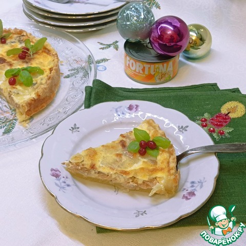 Выкладываем на тесто тертый сыр и кусочки тунца. Затем посыпаем кубиками сыра и поливаем заливкой. -