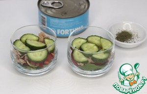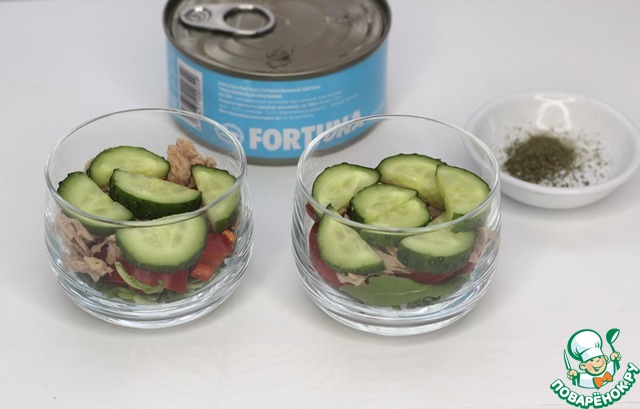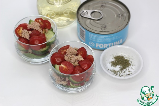Помидоры черри нарезать пополам, крупные черри на 4 части и выложить на слой огурцов. Сверху добавить кусочки тунца. Слои приправить итальянскими травами, по необходимости посолить, поперчить, слегка полить оливковым маслом. Я соль не добавляла.