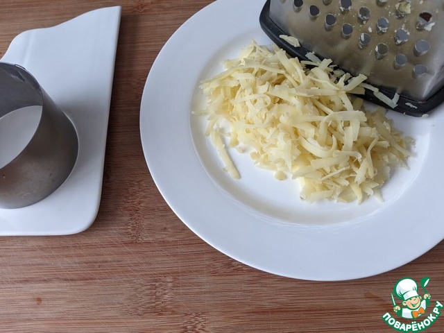 Так как это салат слоёный, то для удобства его приготовления, можно взять большое разъёмное кольцо или готовить в маленьких кулинарных кольцах для порционной подачи. Кольцо кладём на блюдо (тарелку). Для нижнего слоя берём вареный картофель, чистим, трём на тёрку.