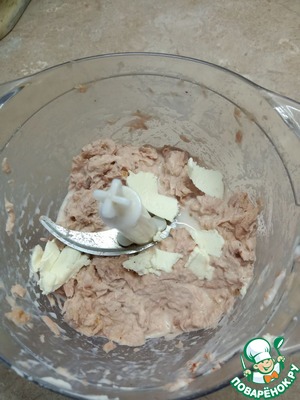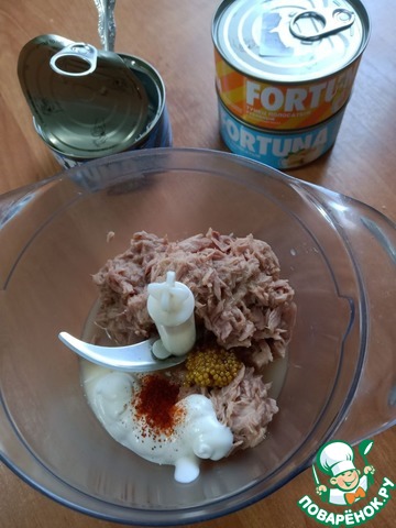 Для этого в чашу измельчителя выложим баночку измельченного тунца, майонез, горчицу, я еще добавила копченую паприку. -