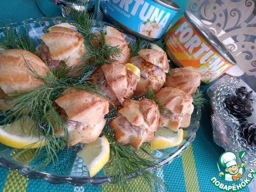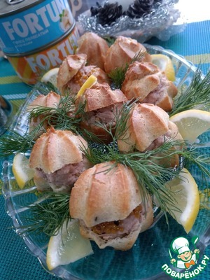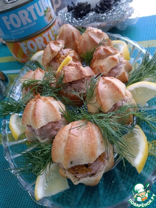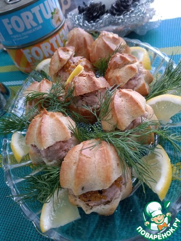 Нежные, ароматные профитроли, с начинкой из тунца, - это отличная закуска буквально на "укус". Смотрится красиво на праздничном столе и это очень удобно!
