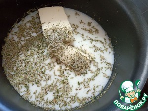 Сначала нам нужно приготовить профитроли, - для этого в кастрюлю налить молоко, воду (с добавлением молока ваши профитрольки будут более нежными), масло, соль и специи ( у меня смесь морской соли с прованскими травами).