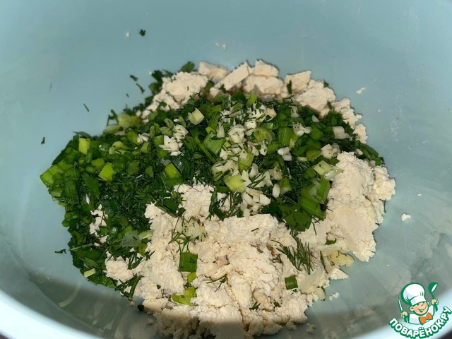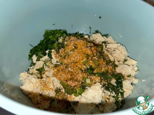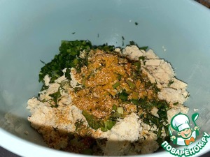 Добавляем специи, сырные дрожжи, соль к тофу и зелени.
