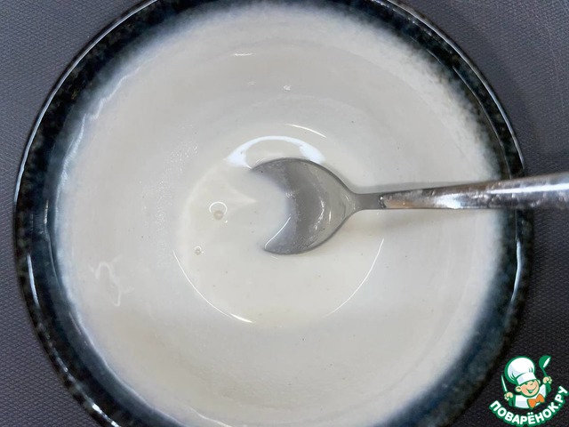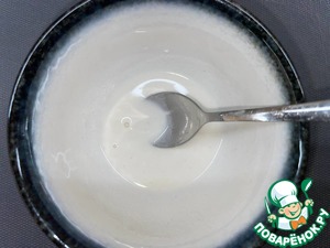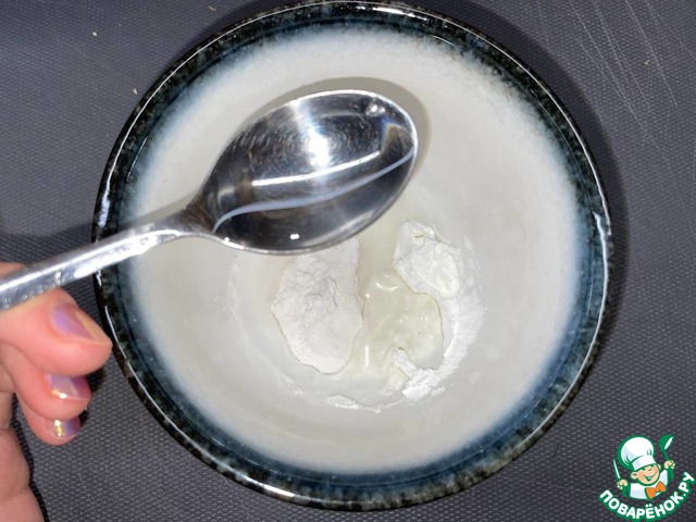 Подготовим "клей" для панировки. Смешаем в отдельной пиале крахмал, муку и воду до консистенции негустого питьевого йогурта.