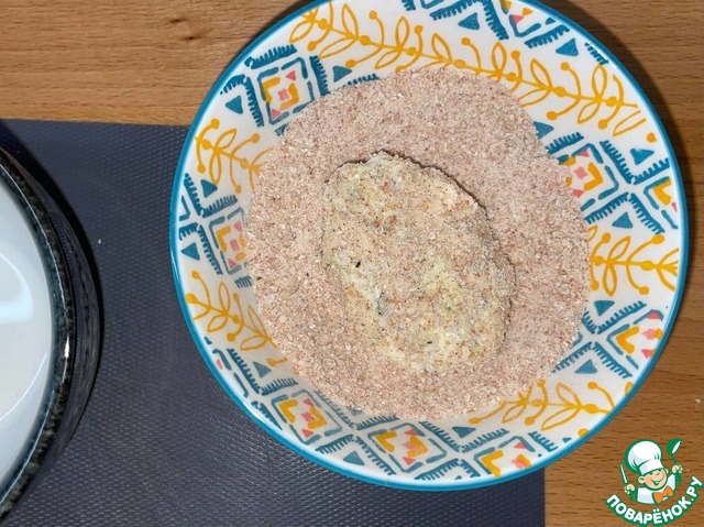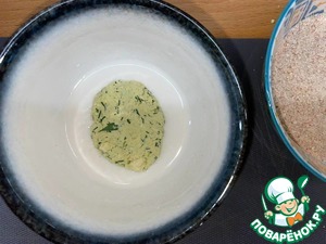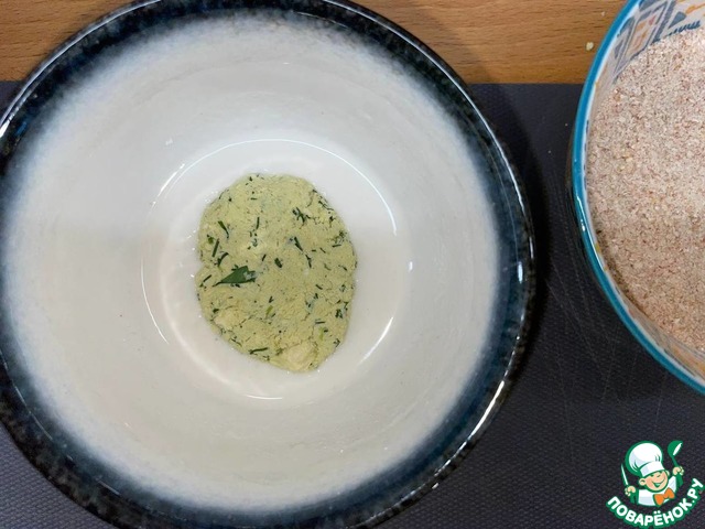 В следующей пиале смешаем панировочные сухари с чесночным порошком, солью и специями по вкусу. А теперь обваливаем "наггетсы" в панировке. Не жалеем панировки!