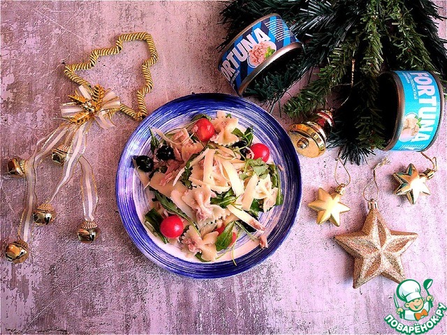 По мотивам средиземноморской кухни. Фарфалле - паста твёрдых сортов, в народе - бантики или бабочки. Готовим низкокалорийный и очень привлекательный салат на новогодний стол для тех, кто придерживается определённой диеты: кто-то следит за весом, а кто-то ест лёгкую пищу без лишних жиров. Для этого будем использовать тунец в с/с.