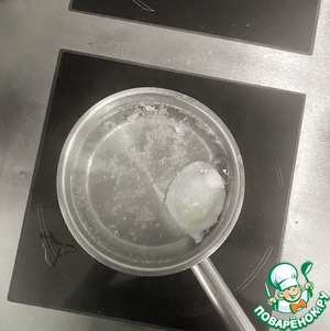 Венчиком или ложкой делаем в сотейнике водоворот и аккуратно вливаем яйцо в центр, помешиваем ложкой воду чтобы яйцо не прилипло ко дну сотейника. Варим яйцо 2-3 минуты.