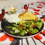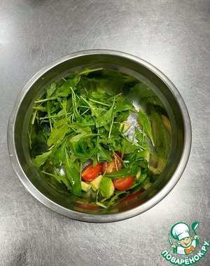 Смешиваем в чаше, рукколу, черри, авокадо, огурец нарезанный слайсом.
