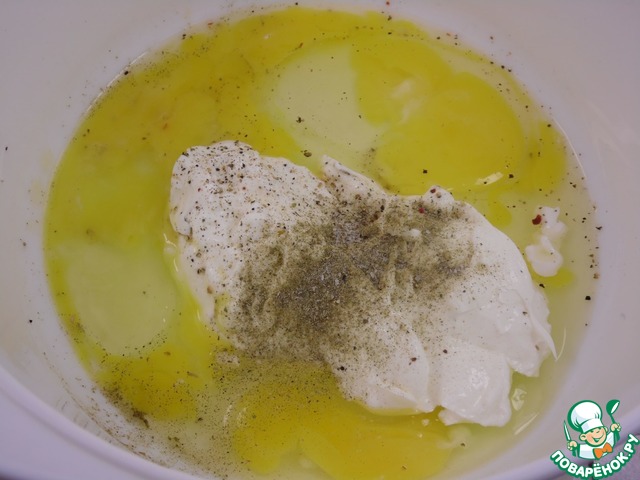 Для теста в миску разбить яйца, добавить сметану, соль, перец и прованские травы. Все хорошо взбить миксером.