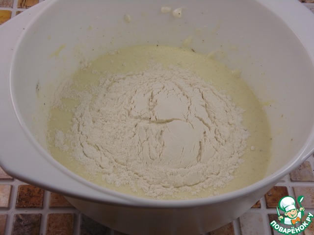 В полученную массу ввести просеянную муку и разрыхлитель, замесить негустое тягучее тесто.
