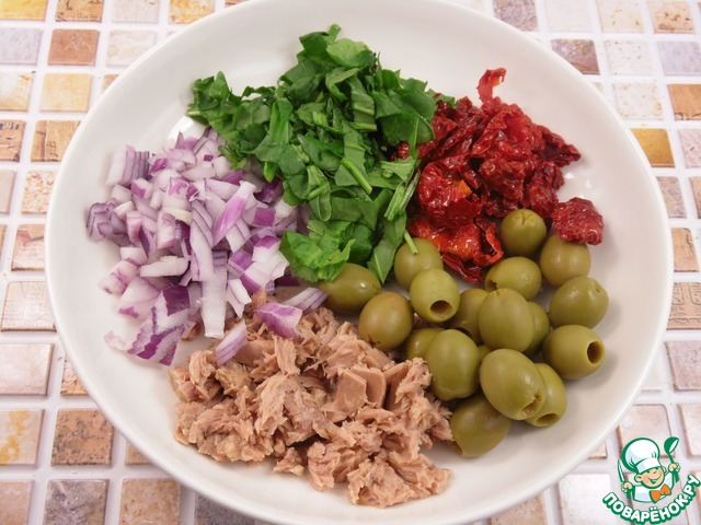 Для начинки из тунца и оливок слить жидкость, вяленые томаты крупно нарезать, красный лук и шпинат мелко нашинковать. Подготовленные продукты смешать.
