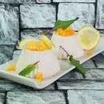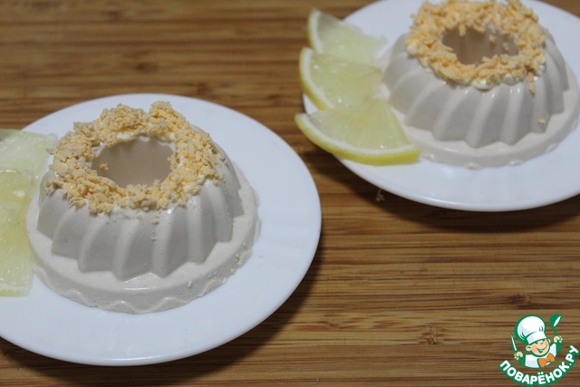 Края мусса украсить майонезом и посыпать тертым желтком.