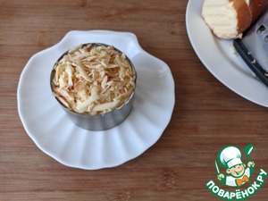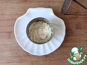 Так как этот салат слоёный, то для удобства его приготовления, можно взять большое разъёмное кольцо или готовить в маленьких кулинарных кольцах для порционной подачи. Кольцо кладём на блюдо (тарелку). Для нижнего слоя берём вареный картофель, чистим, трём на тёрку.